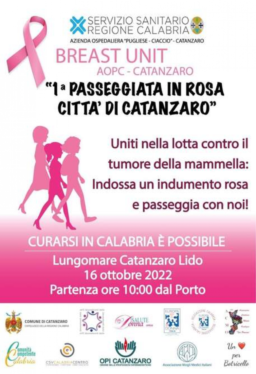 dalle 10, avrà luogo la "Prima passeggiata in rosa della città di Catanzaro", iniziativa di sensibilizzazione sul tumore alla mammella, organizzata dal centro multidisciplinare di senologia (Breast Unit) che opera all'interno dell'azienda ospedaliera "Pugliese-Ciaccio", coordinato dal dottor Francesco Abbonante.