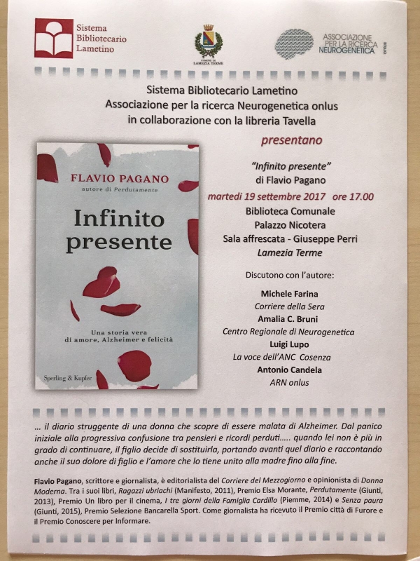 , ha organizzato per domani, 19 settembre alle ore 17, nella sala affrescata della biblioteca comunale di palazzo Nicotera di Lamezia Terme, la presentazione del libro “Infinito presente”, una storia vera di amore, Alzheimer e felicità, scritto dal giornalista e scrittore Flavio Pagano.