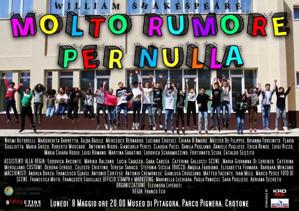 "Molto rumore per nulla" presso il Museo di Pitagora, location sicuramente anti convenzionale finanziata dalla British School of English di Crotone, che ha permesso un utilizzo del tutto nuovo dello spazio, a 360 gradi, col pubblico che abbracciava gli attori e avvolgeva il palco. Lo spettacolo ambientato nella Crotone ai tempi della dominazione spagnola, ha riscosso molto successo tra il pubblico. Il regista Franco Eco, affiancato dalle studentesse Ludovica Arconte e Sara Carcea e dalle docenti Marika Balzano, Lucia Caiazzo e Caterina Gallucci, ha voluto cambiare lo scenario, tradizionalmente messinese per attualizzare e contestualizzare i contenuti.