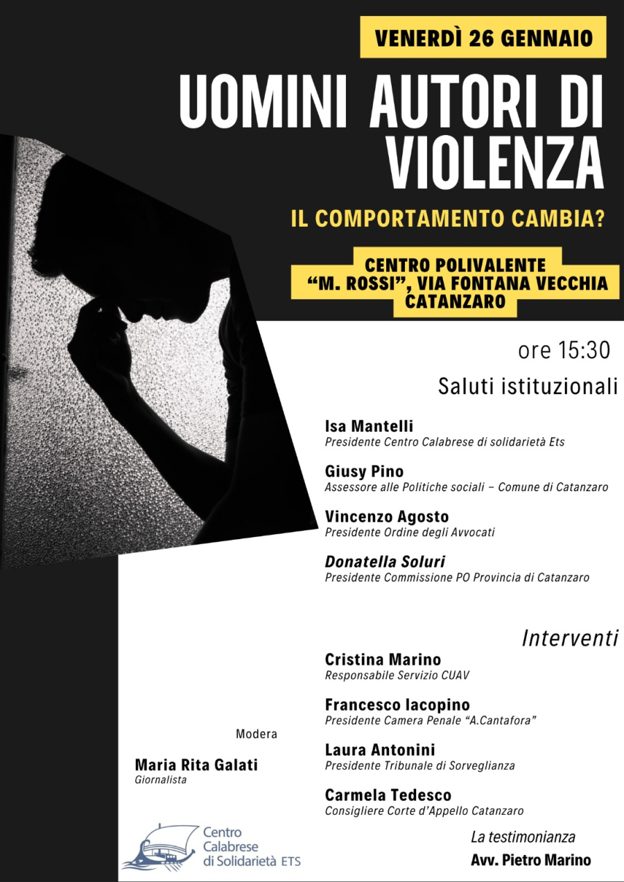 Il convegno dal titolo "Uomini autori di violenza, il comportamento cambia?", vedrà l'avvio dei lavori con i saluti istituzionale della presidente del Centro Calabrese di solidarietà, Isolina Mantelli; Giusy Pino, Assessore alle Politiche sociali - Comune di Catanzaro; Vincenzo Agosto; Presidente Ordine degli Avvocati; Donatella Soluri, Presidente Commissione Pari opportunità della Provincia di Catanzaro. Seguiranno gli interventi di: Cristina Marino Responsabile Servizio CUAV; Francesco Iacopino, Presidente Camera Penale "A. Cantafora"; Laura Antonini, Presidente Tribunale di Sorveglianza; Carmela Tedesco, Consigliere Corte d'Appello Catanzaro. Il confronto sarà arricchito dalla testimonianza dell'avvocato Pietro Marino. Modera i lavori la giornalista Maria Rita Galati.