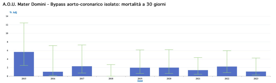 "Rispetto ai PNE 2022 e 2023 abbiamo avuto risultati ancora in miglioramento - afferma il Direttore della Cardiochirurgia Pasquale Mastroroberto - con volumi di interventi di bypass aorto-coronarico (252 nel 2023) che ci collocano al settimo posto in Italia in linea con quanto indicato dal D.M. 70/2015 che prevede almeno 200 interventi/ anno. Molto soddisfacenti anche gli indici di mortalità sempre per il bypass aorto-coronarico con Catanzaro-Azienda Dulbecco tra le prime 10 in Italia (1.39% rispetto a 1.8% media nazionale). In questo modo se valutiamo la combinazione tra volumi e esiti allora il risultato è sicuramente superiore rispetto agli anni precedenti e soprattutto molto importante se raffrontato a quello di tutte le altre strutture cardiochirurgiche italiane. Soddisfacenti anche i volumi di interventi per patologie isolate a carico delle valvole cardiache".