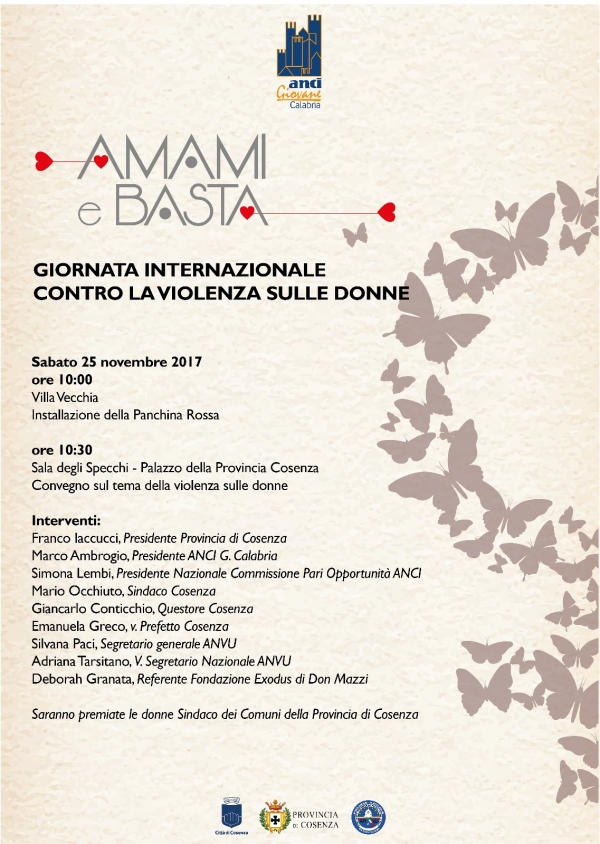 sabato 25 novembre 2017, dalle ore 10:00 , presso la Villa Vecchia di Cosenza (Piazza XV marzo) e, a seguire, la Sala degli Specchi (Palazzo della Provincia – Piazza XV marzo – Cosenza)