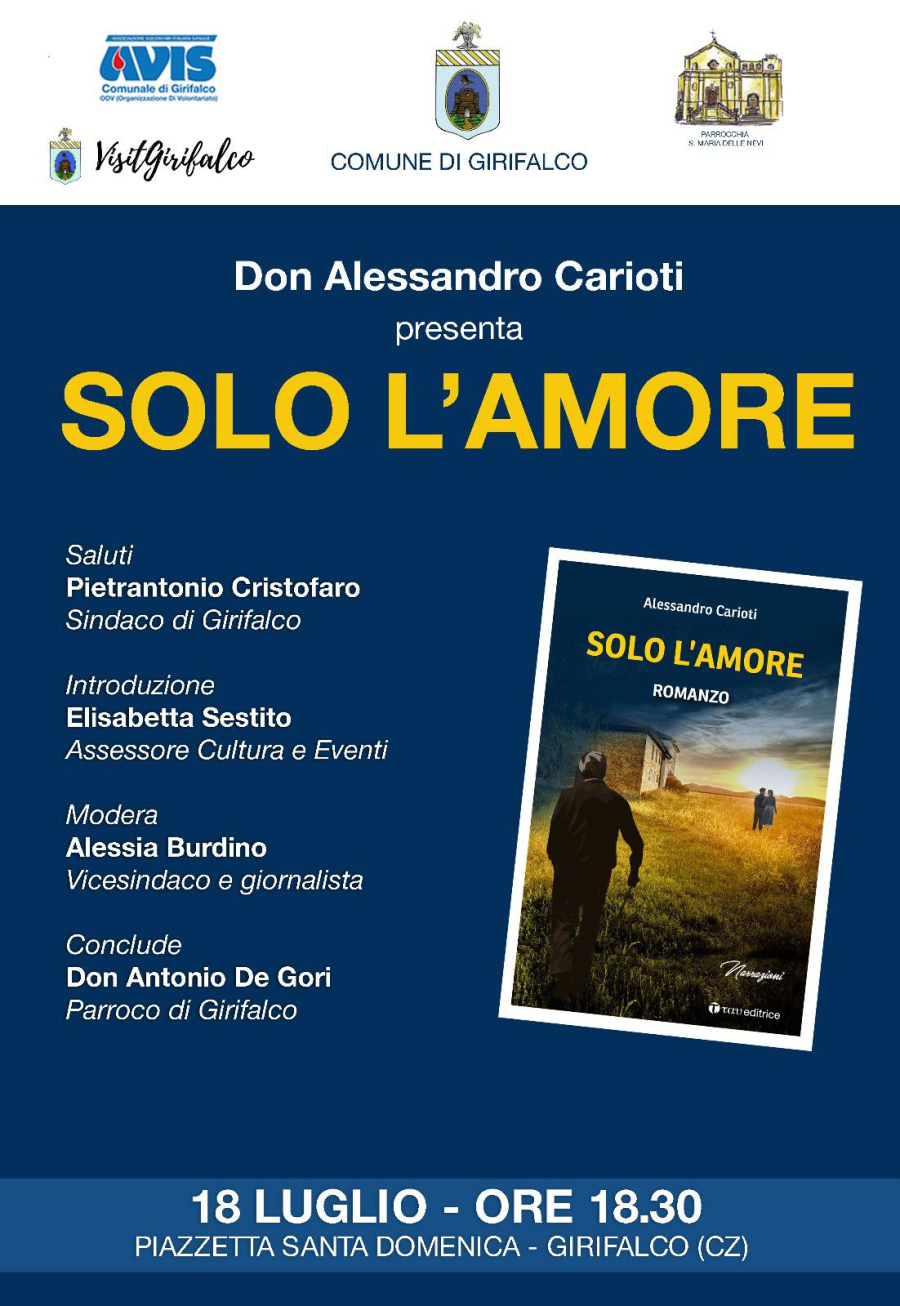 alle ore 18.30, presso la suggestiva Piazzetta Santa Domenica. Don Alessandro Carioti, sacerdote e scrittore, presenterà il suo nuovo romanzo intitolato "Solo l'Amore". L'incontro sarà aperto dai saluti istituzionali del Sindaco Pietrantonio Cristofaro e dall'introduzione dell'Assessore alla Cultura ed Eventi, Elisabetta Sestito. A moderare l'evento sarà la Vicesindaco e giornalista Alessia Burdino, mentre le conclusioni saranno affidate al Parroco di Girifalco, Don Antonio De Gori. La serata sarà arricchita da momenti artistici di particolare intensità: la lettura di brani del libro a cura di Siria Proganò accompagnate da interventi musicali eseguiti da Barbara Posenato, offrendo così al pubblico un'esperienza immersiva tra parola, riflessione e musica. L'iniziativa, patrocinata dal Comune di Girifalco, dall'Avis Comunale di Girifalco e dalla Parrocchia Santa Maria delle Nevi, rientra nel programma delle attività culturali promosse per valorizzare il dialogo tra fede, letteratura e comunità. Il romanzo di Don Carioti si propone come un viaggio umano e spirituale nel significato profondo dell'amore, della speranza e della relazione con l'altro. Un messaggio universale, capace di toccare le corde più intime dell'animo umano.