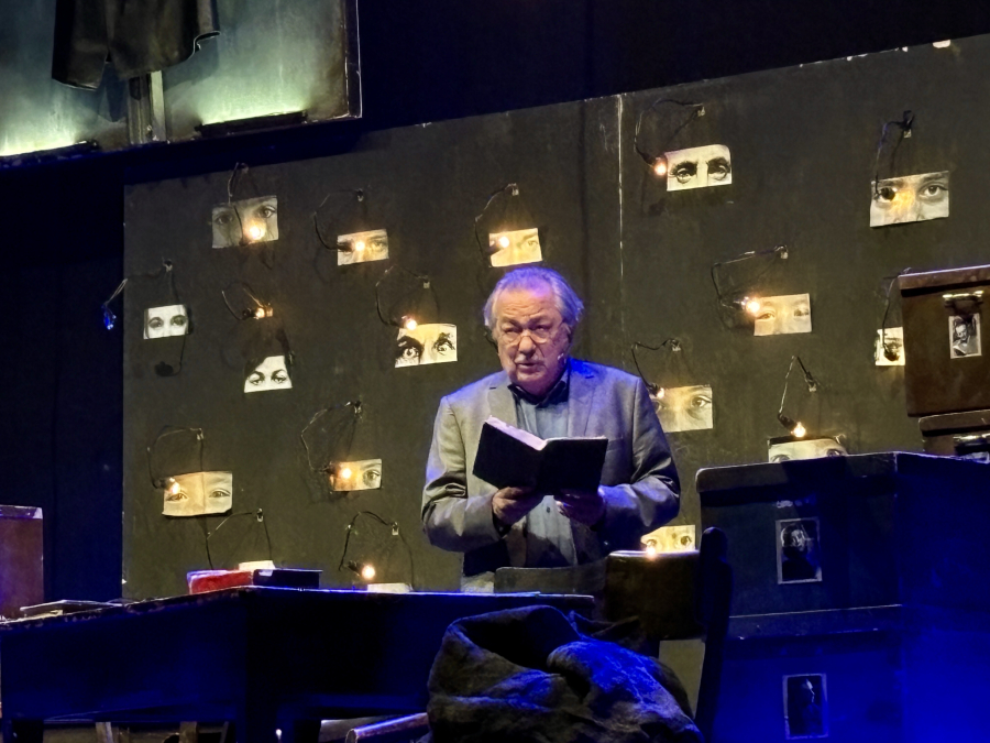Gli occhi delle vittime, sono anch'essi parte della scenografia. Le loro foto sono appese numerose sul fondale, mentre restituiscono lo sguardo al pubblico. Girone si muove tra gli scatoloni e le due scrivanie poste sul palcoscenico, prende fogli su cui legge le date e i numeri che hanno costruito, mattone dopo mattone, l'orrore provocato da Hitler. Si interroga sulle origini del Male, coinvolge gli spettatori quando spiega di come i neonazisti abbiano messo una bomba nella sua casa, o quando un ufficiale da lui smascherato avesse provato a strangolarlo. Per un attimo si ha come l'impressione che il suo racconto faccia parte di un film d'avventura, poi si rimane senza fiato quando ci si rende conto che tutto è realmente accaduto.