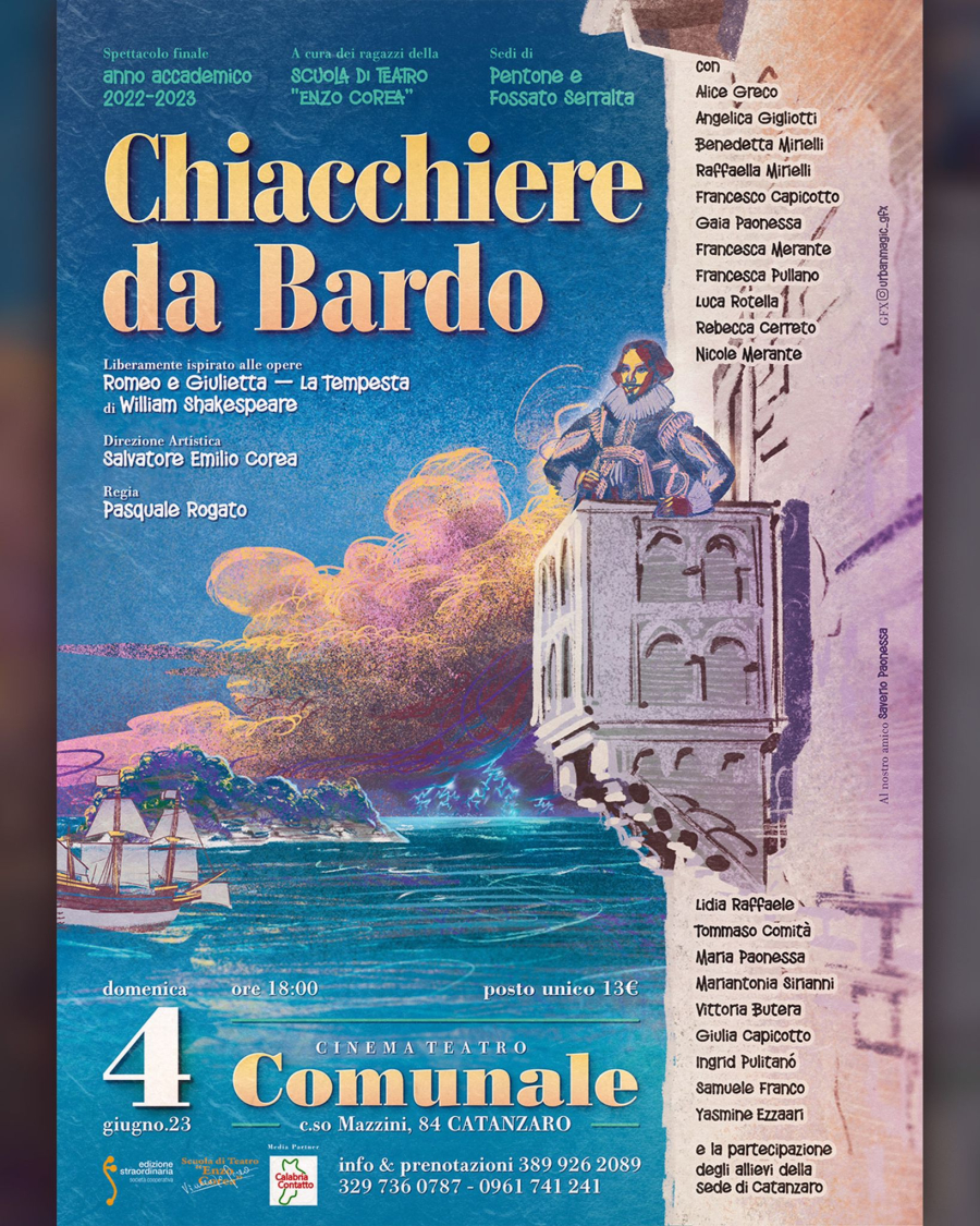 "Chiacchiere da Bardo" in scena domenica 4 giugno alle 18.30 al Teatro Comunale di Catanzaro è un viaggio tra due opere importanti come "Romeo e Giulietta" e "La Tempesta". Un unico filo che lega due storie diverse ma vicine in alcuni tratti. Un finale tragico e uno magicamente lieto che porteranno lo spettatore a riflettere su emozioni, sentimenti e condizioni di vita tutt'altro che lontani da quello che viviamo oggi. Più di venti i ragazzi in scena, provenienti dalle sedi esterne di Pentone e Fossato Serralta della Scuola di Teatro "Enzo Corea" insieme ad altri della sede centrale di Catanzaro.