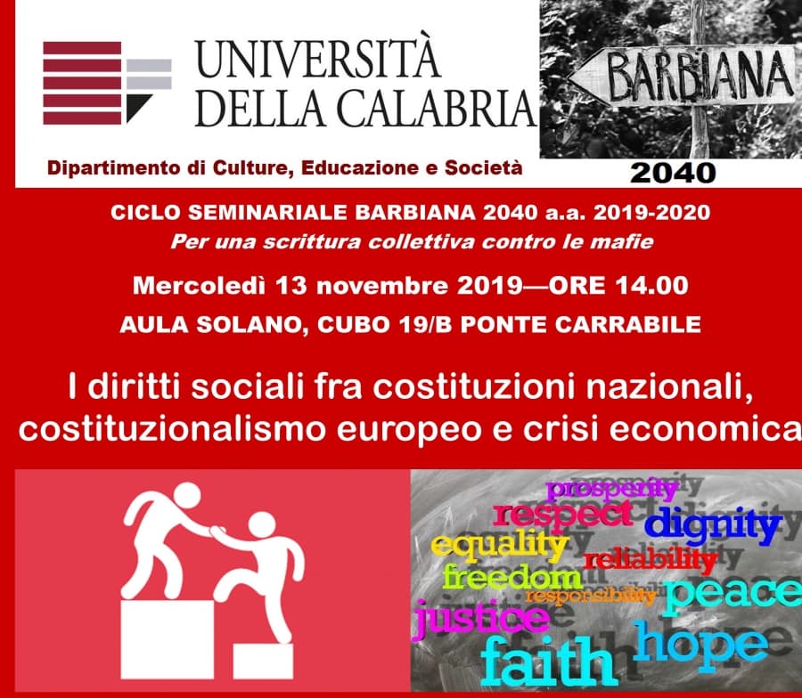Si terrà domani, mercoledì 13 novembre, alle 14 presso l’aula Solano del cubo 19/B dell’Università della Calabria il seminario: I diritti sociali fra costituzioni nazionali, costituzionalismo europeo e crisi economica. A relazionare sul tema sarà il professore Silvio Gambino, emerito di Diritto pubblico comparato e già preside-fondatore all’Unical della Facoltà di Scienze Politiche. L’iniziativa, che sarà introdotta da Giancarlo Costabile, si inserisce nell’ambito delle attività annuali del Laboratorio di Pedagogia dell’Antimafia, nato il 23 maggio 2011 e giunto al suo nono anno di attività.