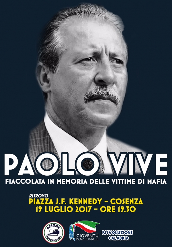 l'associazione RIeVOLUZIONE CALABRIA promuove la manifestazione "PAOLO VIVE: Fiaccolata in memoria delle vittime di mafia" che si terrà il 19 luglio a Cosenza per ricordare e onorare la memoria di Paolo Borsellino, della sua scorta e di tutte le vittime uccise per mano della criminalità organizzata.