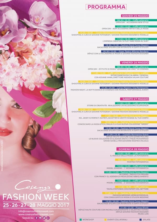Ne saranno protagonisti i giovanissimi interessati a investire nel proprio futuro dando sfogo alla propria creatività. Nel pomeriggio, invece, bellissime modelle e giovani fashion designer invaderanno i luoghi più belli del centro storico di Cosenza e del centro città per uno shooting fotografico, curato da giovani fotografi professionisti, mentre ospiti d’onore e stilisti saranno intervistati nel Fashion Point posizionato su Corso Mazzini.