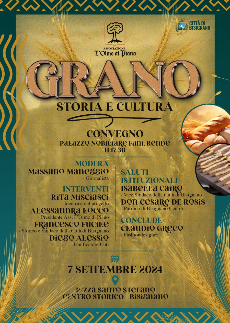 Un'occasione per celebrare il legame con la propria terra, le proprie tradizioni e la fonte primaria di ogni alimento. Non poteva che essere questo un momento di gioia e celebrazione. Da qui l'idea di organizzare una vera e propria festa del grano, con approfondimenti a cura di Rita Misciasci – ideatrice del progetto, Alessandra Locco – Presidente Ass. L'olmo di Piano, Francesco Fucile – storico e Sindaco di Bisignano , e Diego Alessio – Pianificatore Cuti, moderati dal giornalista Massimo Maneggio.