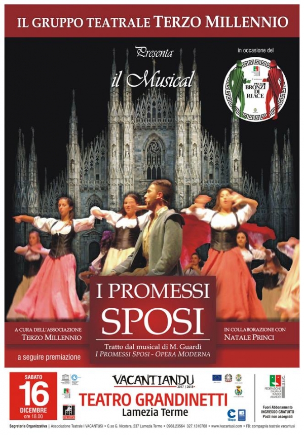 Dopo la premiazione, intorno alle ore 20.30, ci sarà lo spettacolo gratuito proposto dagli attori del gruppo teatrale “Terzo Millennio”, che porteranno in scena il musical “I Promessi Sposi”, tratto da “I Promessi sposi. Opera moderna” di Michele Guardì, con la collaborazione di Natale Princi.